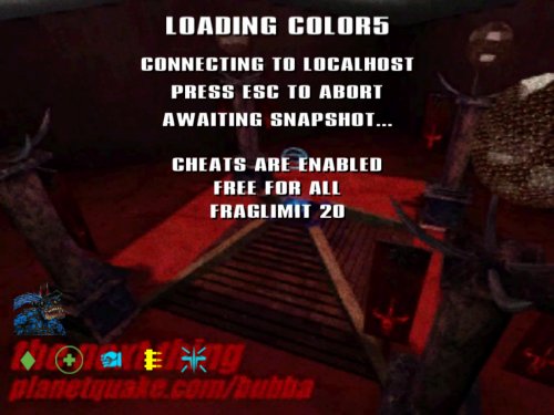 Creating in-game support When you first load a map in Q3A there's an image of the map with the title and maybe a little info on the level it'self. You can do this as well with your custom maps by simply capturing a screen shot of your map while playing it on your machine. By hitting the 'f11' key while the game is running it will write a .tga file to the 'screenshots' folder in baseq3 within the Quake 3 directory. You'll need a basic graphics editor such as Paint Shop Pro or Adobe's PhotoShop. You can get a demo of Paint Shop here. Below is an example of a screen shot that has been touched up and converted to a .jpg to conserve space.