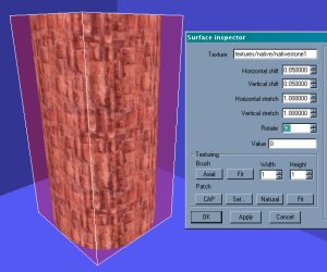 Editing Shortcuts Below is a basic cylinder with a brick texture applied and for those of you who have experimented with curves the image below should be familiar. Textures that are used with curves will stretch over the surface and look very distorted. The quick shortcut to make textures fit perfectly over patches is "ctrl+n". Now it's sized to fit the brush.